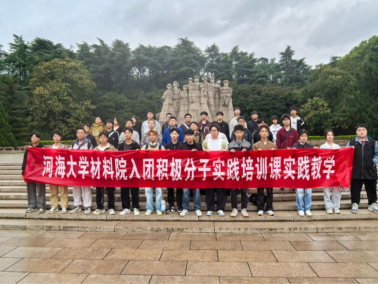 细雨朦胧中,入团积极分子们撑伞集结于雨花台景区入口。古朴的建筑与苍劲的松柏交相辉映,仿佛在无声诉说着这里的历史厚重。大家在讲解员的引导下,带着对革命先烈的崇敬之心,开启了这段红色寻访之旅。大家自发放慢脚步、放轻声音,用沉默与凝望,向长眠于此的英烈致以最崇高的敬意,每一步踏在雨花台的土地上,都似在与先辈们进行一场跨越时空的精神对话。