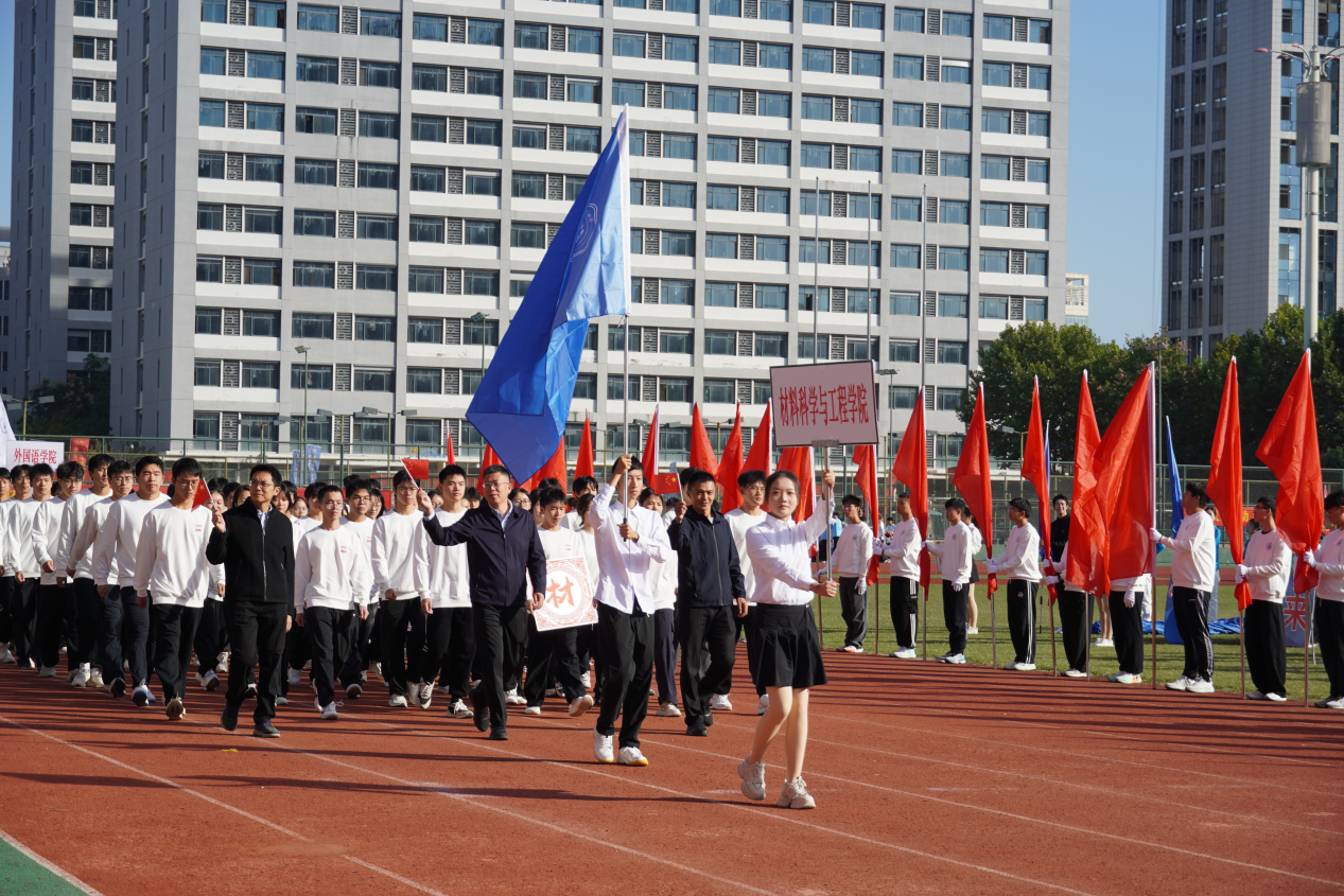 上午八点整,运动会开幕式在万众期待中正式开始。学院党委书记陈伟刚,副院长宋丹和党委副书记、副院长辛绍权带领学生方阵,迈着整齐划一的步伐走向主席台。材料院学子们身着百十校庆特色文化衫,高高举起学院为河海110周年校庆精心设计的带有金坛刻纸元素的旗帜,步伐矫健,动作协调,配合“材心赋运动,百十竞巅峰”的嘹亮口号与精彩队列变换,彰显出学院学子团结进取的精神,并代表学院全体师生向学校送上百十祝福,赢得现场热烈掌声。