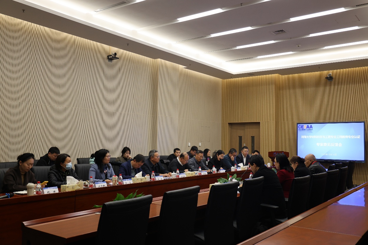 见面会上,沈扬副校长对各位专家的到来表示热烈欢迎。他介绍,河海大学作为以水利为特色的教育部直属全国重点大学,正全力推进“世界一流特色研究型大学”建设,学校高度重视工程教育专业认证,近年来已出台10余个校级认证机制文件,加强认证过程化管理,通过研发OBE智慧教务系统、升级AI课堂教学分析系统、创设“三位一体”学生评教系统等,构建全流程、精细化的质量监测体系。专家组组长宋晓岚教授介绍了此次认证的任务、目的及考查要求流程。材料科学与工程专业负责人赵永好教授汇报了专业建设历程,并补充说明认证自评报告内容。在质询环节,专家组成员结合自评报告审读情况,围绕培养方案修订、教师教学质量评价、第二课堂建设、招生与就业等方面,与学校相关职能部门和学院负责人进行了深入交流。